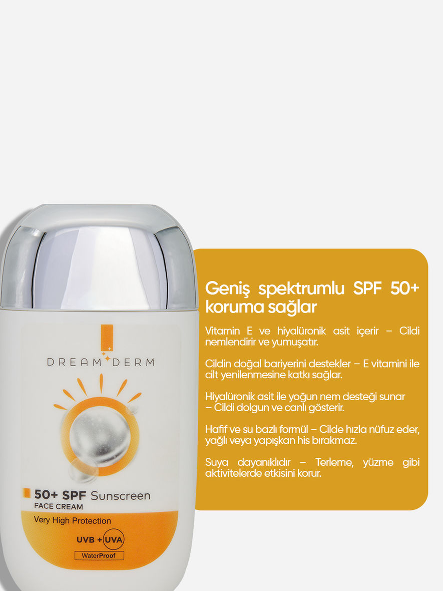 DreamDerm Geniş Spektrumlu Ultra UVA ve UVB Güneş Koruyucu, SPF 50+ ile en güçlü korumayı sunar ve içerdiği Vitamin E ile cildinizi besler. Hiyalüronik asit ile nemlendirir, cildinize yumuşaklık ve dolgunluk kazandırır.